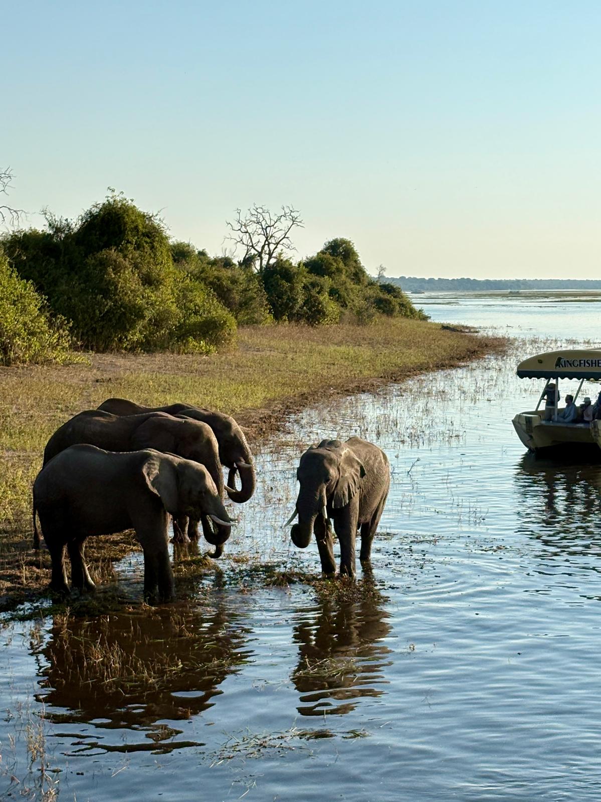 Dann: Chobe-Nationalpark. Elefantenherden stampfen durchs Gras, Nilpferde blinzeln aus dem Wasser, während wir im offenen Geländewagen und per Boot auf Safari gehen – so nah, dass man das Trompeten der Elefanten spüren kann.